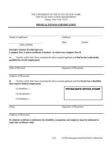 AT-16 THE UNIVERSITY OF THE STATE OF NEW YORK THE STATE EDUCATION DEPARTMENT Albany, New York 12234 PHYSICAL FITNESS CERTIFICATION _____ (Name of Applicant) (Address) ... Fetch This Document